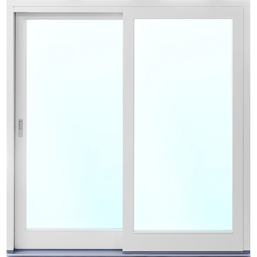 Et to-delt fasadeparti i hvitlakkert aluminium der en av delene er en skyvedør for en enkelt, pent og stilrent tilknytning av rommene utendørs og innendørs.