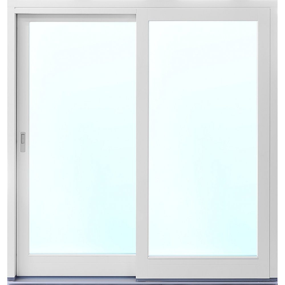 Et to-delt fasadeparti i hvitlakkert tre hvor en av delene er en skyvedør som skaper en sammenheng mellom rommene utendørs og innendørs på en enkel, flott og stilfull måte.