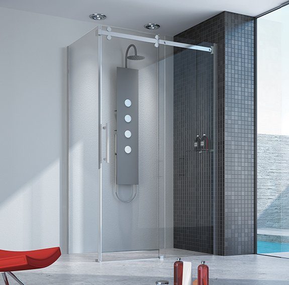 Moderne dusjhjørne med skyvedør med bredt utvalg av størrelser. Standardhøyde 210 cm. Glasspartiene er laget av 8 mm overflatebeskyttet sikkerhetsglass. Overflatebeskyttelsen GLASS PROTECT er en overflatebehandling som gjør at vannet renner av lettere og etterlater mindre kalk og smuss. Modellen er solid og har store og stillegående rullelagre som sikrer en enkel og jevn skyvedør - til tross for høy vekt.
