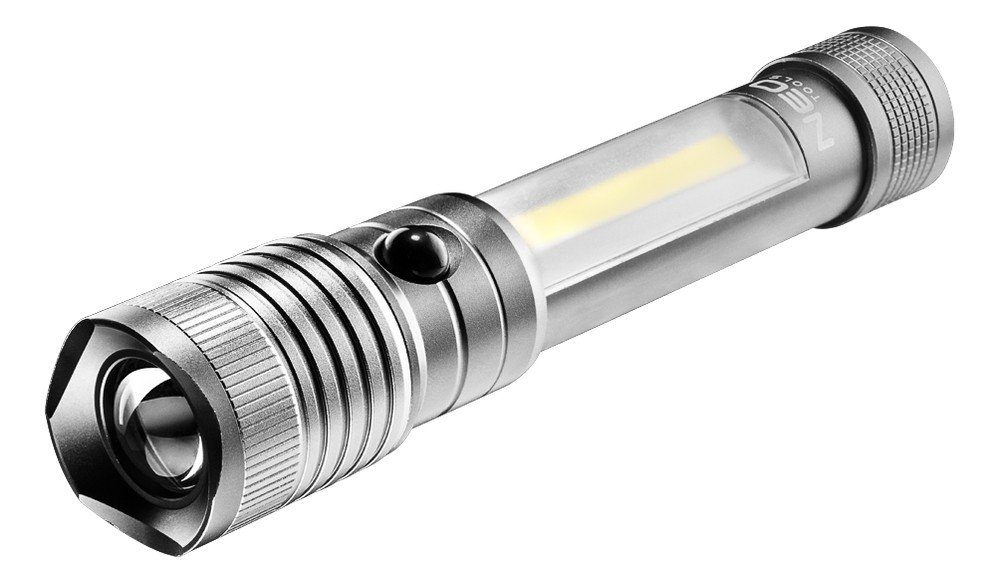 Lommelykt av aluminium av høy kvalitet med 2 LED-lamper av høy kvalitet. 3W COB 240 lumen, sterkt sidelyd og 5 W Cree XPG 200 lumen sterkt topplys. Topplyset har en zoomfunksjon som gjør det mulig å endre lysets fokus. Operer med fire AAA-batterier. Sterk magnet i huset gir flere festemuligheter. Allsidig, til bruk hjemme, i verkstedet, garasjen, kjelleren og på campingplassen. 3 posisjoner, inspeksjon 100 % inspeksjon 50 % overlsst 100 %. Lyser i opp til 3,5 timer. CE-sertifisert.