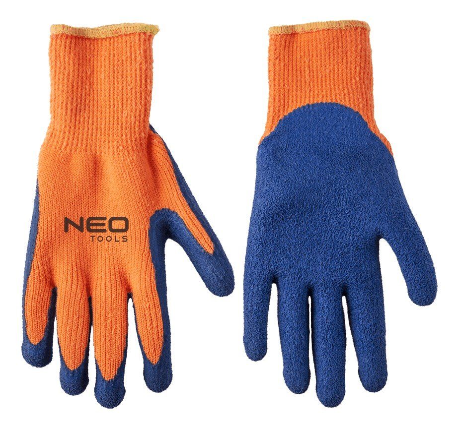 Varme arbeidshansker laget av akryl. Håndflaten er dekket med hard lateks, noe som gjør at verktøyet ikke sklir og beskytter mot støv og riper.