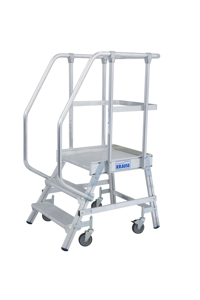 Denne arbeidsplattformen er laget av aluminium, noe som gjør den robust og solid. Patformen har hjul, noe som gjør den svært enkelt å transportere, plattformen er dessuten formet slik at den kan stå tett inntil hyller, vegger og mere. Trappen har 3 trinn og en høyde på omtrent 1,70 meter, noe som kan gi deg en arbeidshøyde på ca 2,70 meter.