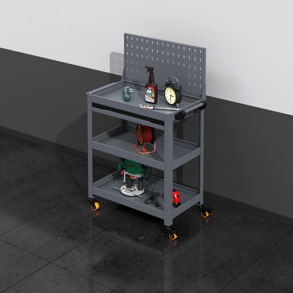 Denne arbeidsvognen er en perfekt løsning for verksteder, garasjer og industrimiljøer. Med sitt kompakte design og smarte oppbevaringsalternativer hjelper den deg med å holde verktøyene dine organisert. Vognen er utstyrt med tre romslige hyller og en praktisk opphengsplate for enkel tilgang til verktøyene dine.