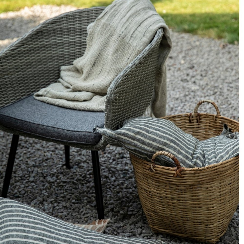 Aster er en funksjonell og elegant spisestuestol som passer perfekt ved bordet på terrassen eller i en innglasset vinterhage. Den grå kunstrottingen kombinert med svarte metallben skaper en moderne kontrast, mens den medfølgende mørkegrå puten gir ekstra komfort til hvert sete.