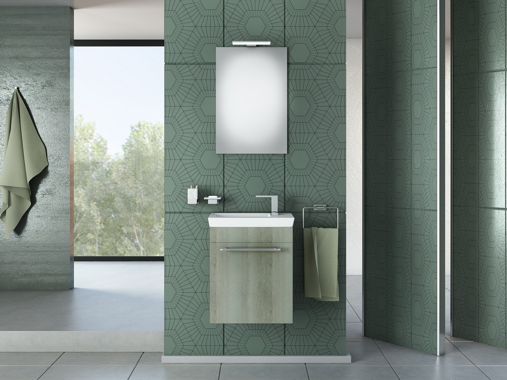 Iris møbelpakke fra Nordamist med vegghengt grått servantskap, porselensservant og speil.