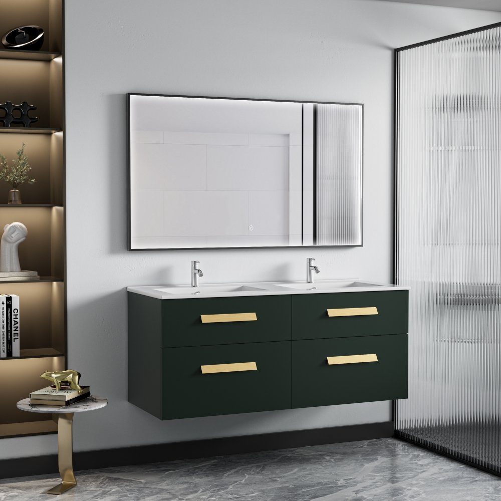 Denne baderomspakken har et moderne og stilig design med funksjonelle detaljer, perfekt for et elegant og praktisk bad. Baderomsmøblene består av en vegghengt dobbel kommode i MDF, lakkert for å gi en elegant overflate. Den doble kommoden har fire romslige skuffer som lukkes mykt og lydløst takket være myktlukkende hengsler. Det stilige LED-speilet med aluminiumsramme gir et moderne preg og lyser opp badet effektivt med dimbar lysstyrke, som enkelt reguleres med en berøringsknapp.
