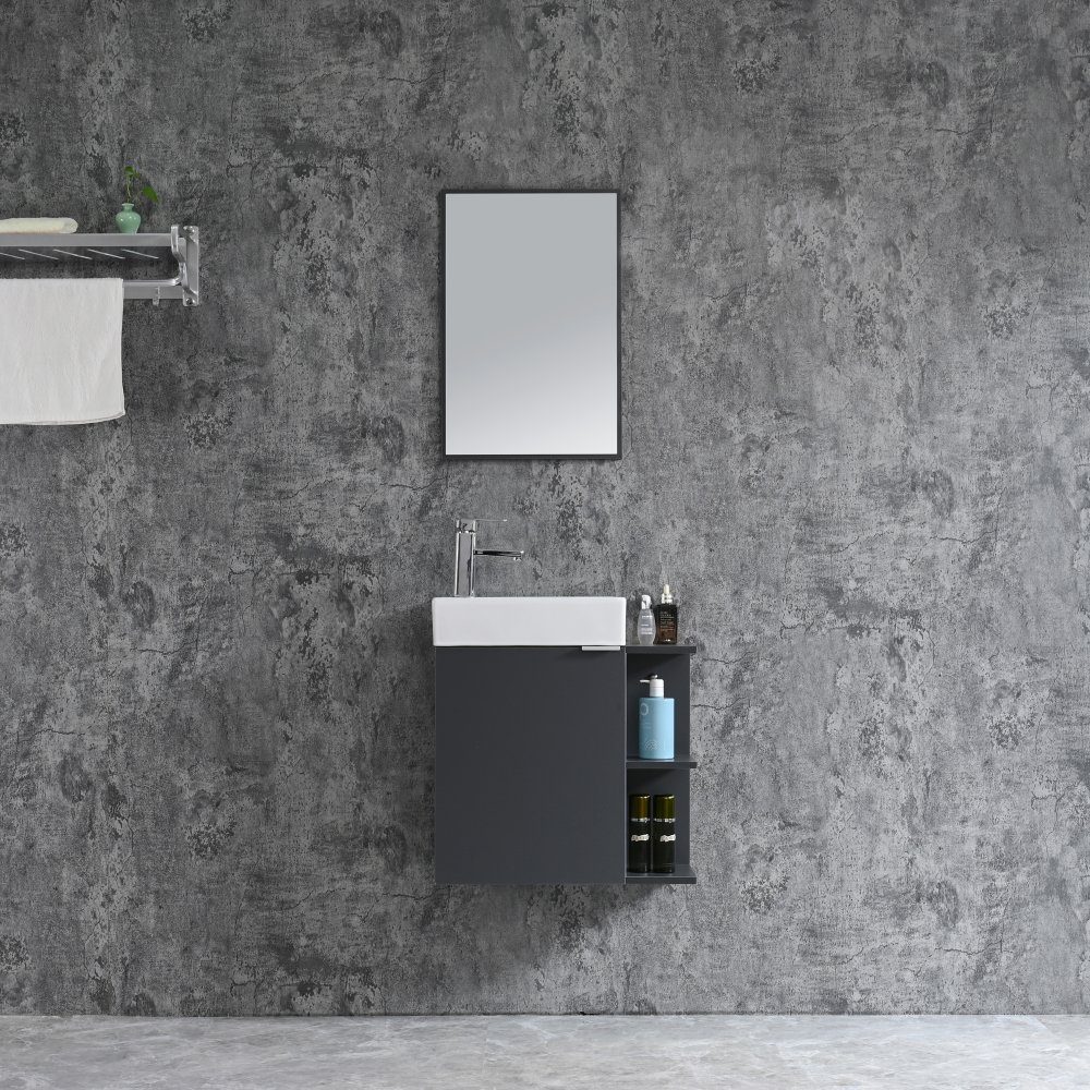 Skapet har en enkel en-dørs design utstyrt med myke hengsler , som gir en stille og jevn lukking hver gang. En praktisk hylle inne i skapet gir ekstra oppbevaring. Møblene monteres enkelt på veggen og festes på begge sider for en stabil og stilig montering.