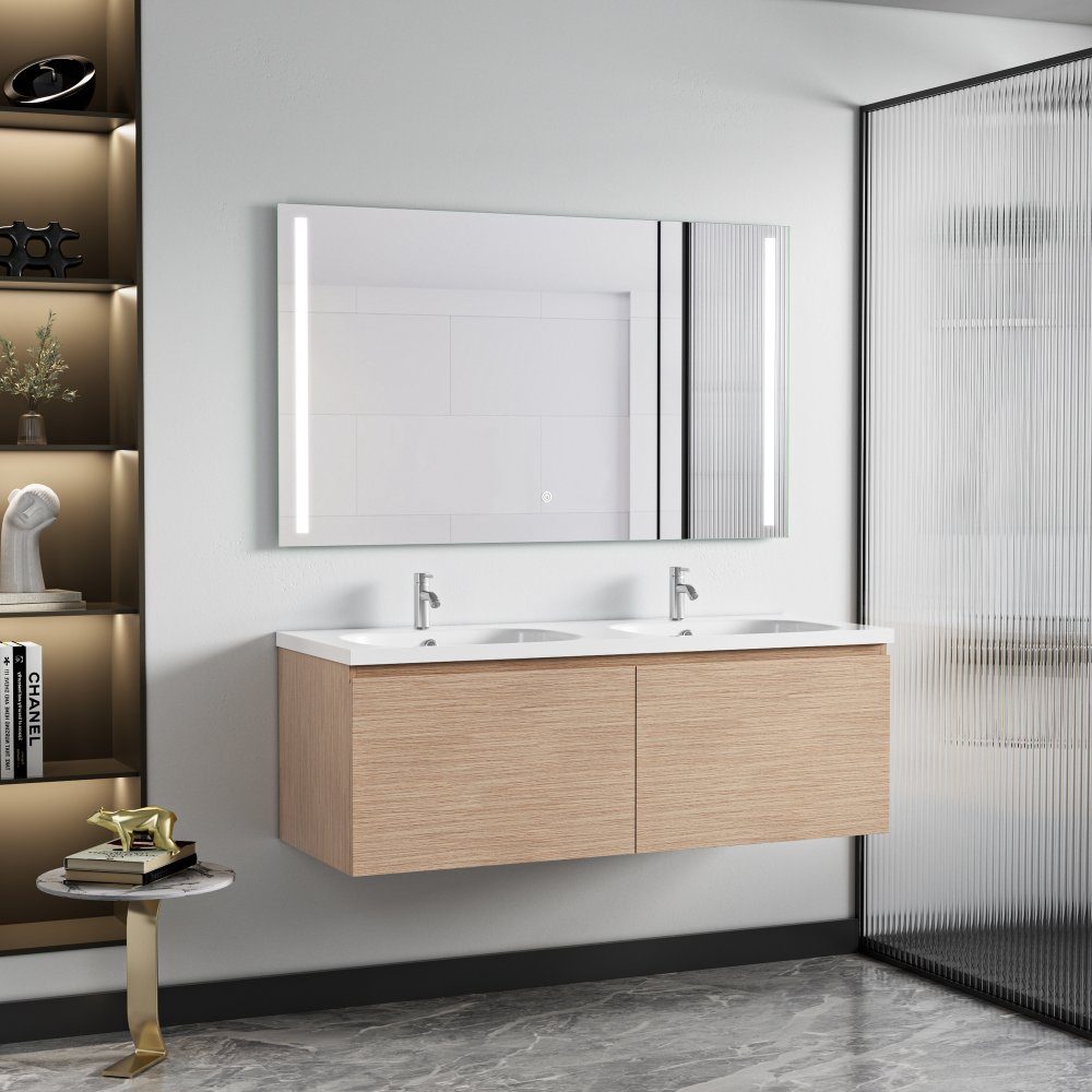 Alle dører og skuffer har smart myk lukking for din bekvemmelighet. En veggmontert kommode gjør det enkelt for deg å få tilgang til og rengjøre under. De doble keramiske vaskeservantene er enkle å holde rene og passer fint sammen med skapets moderne trefinish.