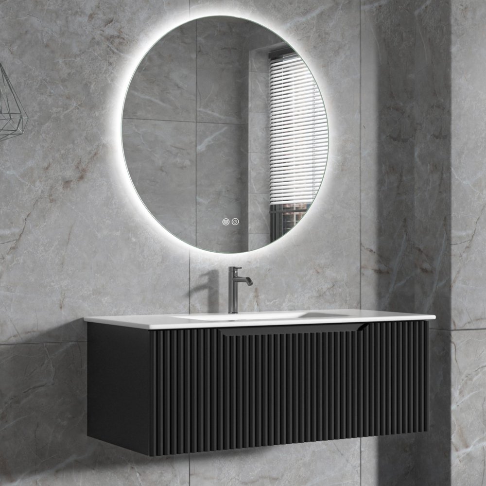 Servantskapet er laget av slitesterkt MDF-materiale . Møblene er elegant malt i svart med vertikale lameller som gir en rolig og harmonisk følelse. Det er også en stor, romslig skuff med myklukkefunksjon for enkel oppbevaring av alt som trengs på badet.