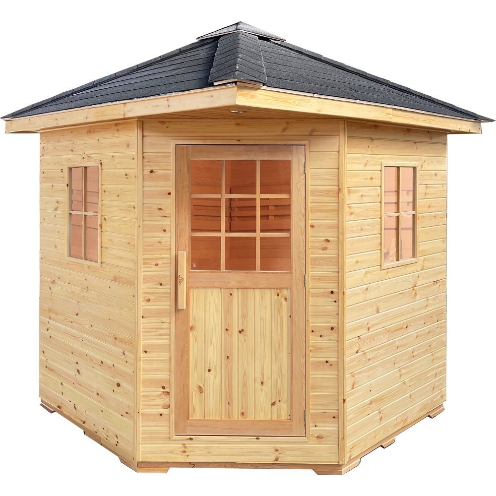 Badstuen er laget av FSC-sertifisert kanadisk hemlock , et slitesterkt og varmebestandig tre som gir en behagelig badstueopplevelse. De store vinduene og herdet glassdør med sprosser skaper en lys og innbydende atmosfære samtidig som de bidrar til en tradisjonell og stilig estetikk.