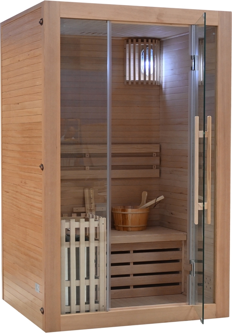 Klassisk badstue med en Harvia badstuovn og god plass til 2 personer. Materialet er helt av kanadisk Hemlock, med glasspaneler til vinduer og dør. Badstuen har belysning og termometer.