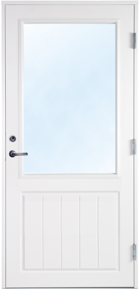 Døren er dekorert i bunnen både på innsiden og utsiden. Vinduet er en doble isolerrute med Argon, som gir lav U-verdi.