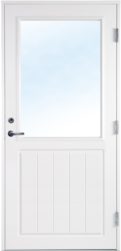 Døren er dekorert i bunnen både på innsiden og utsiden. Vinduet er en doble isolerrute med Argon, som gir lav U-verdi.