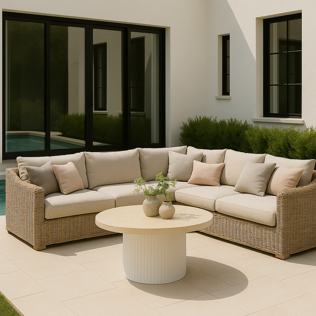 - Materiale: Fiberbetong, Syntetisk rotting, Polyester