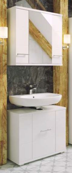 Bari møbelpakke servantskap, servant og speilskap. Møblene er laget av MDF med hvitt lakk på skapsdører og sidepaneler i hvit laminat.