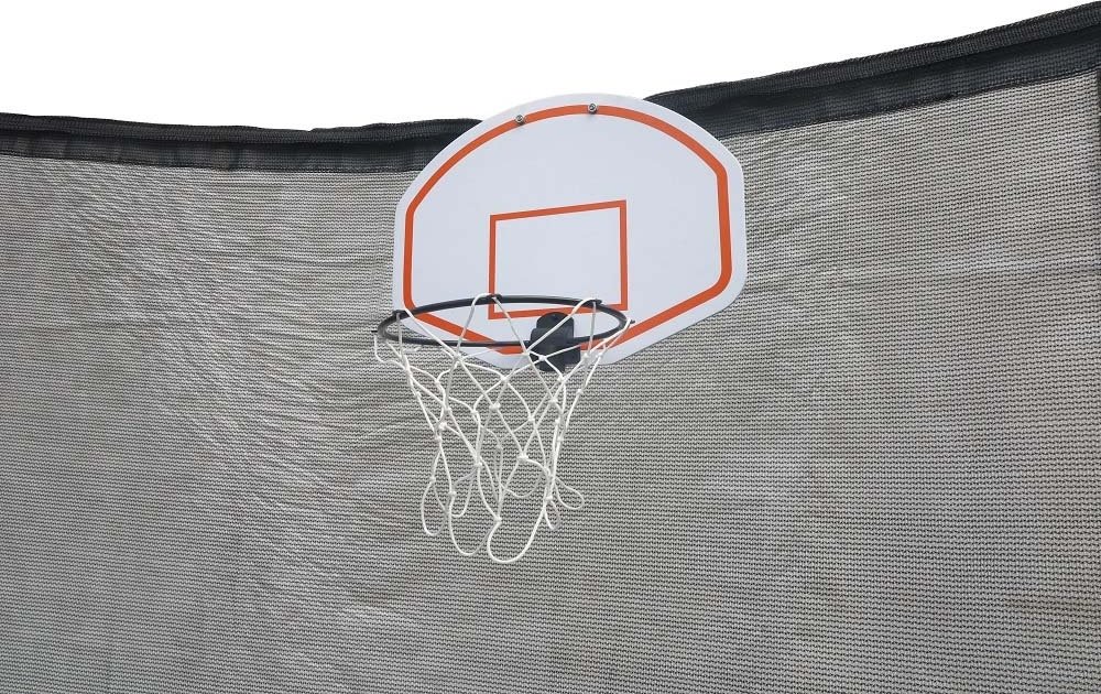 Basketkurv med tilhørende ball og ballpumpe, basketkurven henges enkelt opp på trampolinens sikkerhetsnett.