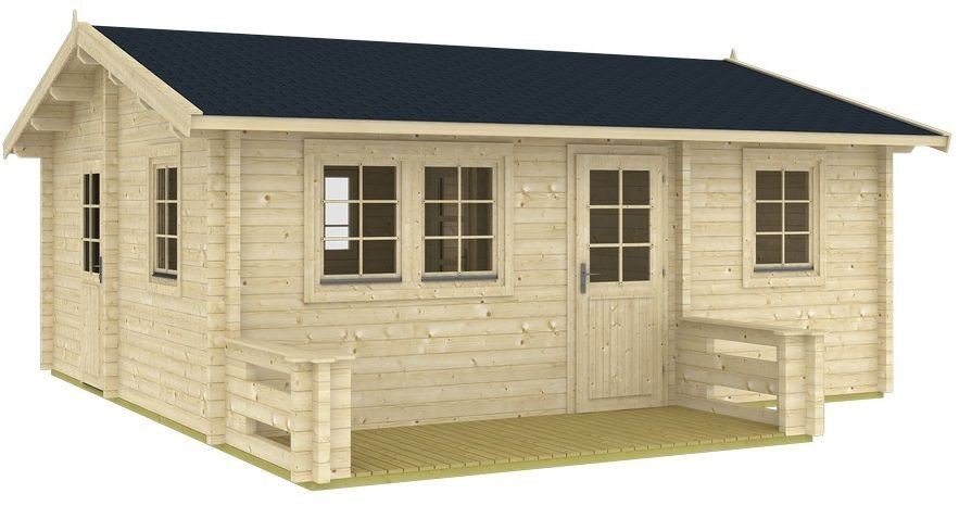 - Dører og vinduer: Laget av ekstra tørket laminert gran. Vindu med 2-lags (3-18-3 mm) og terskel for dører av rustfritt stål. Vinduene er åpningsbare innover og utover. Alle delene som trengs for montering er inkludert.