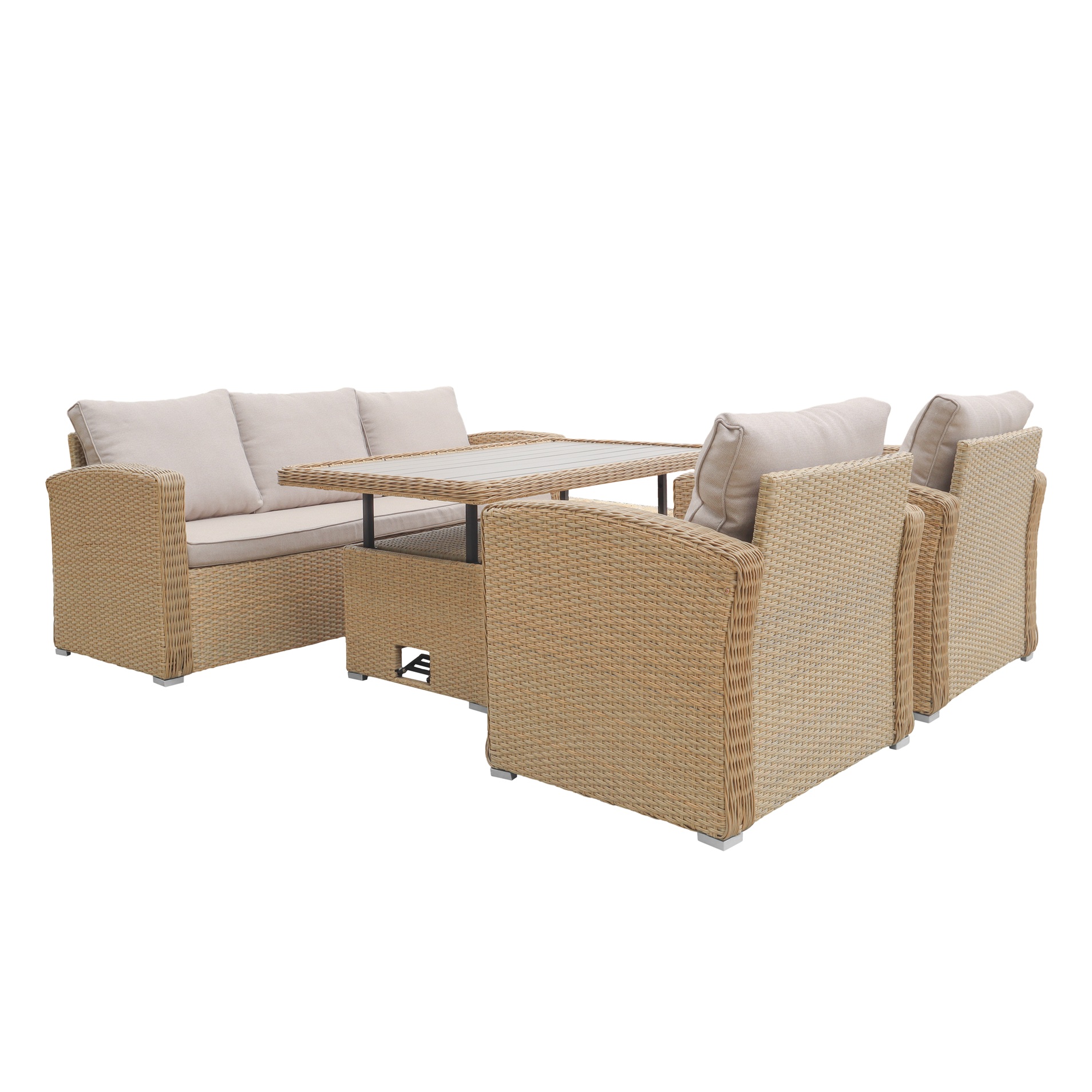 Sofasett i rund naturfarget syntetisk rotting. Utegruppen består av en 3-seters sofa, 2 matchende lenestoler og et justerbart bord. Bordet er laget av syntetisk rotting med gråbeige noonwood, som har høy slagfasthet. Bordet kan brukes både som salongbord eller spisebord ved å bare trykke på bordet.