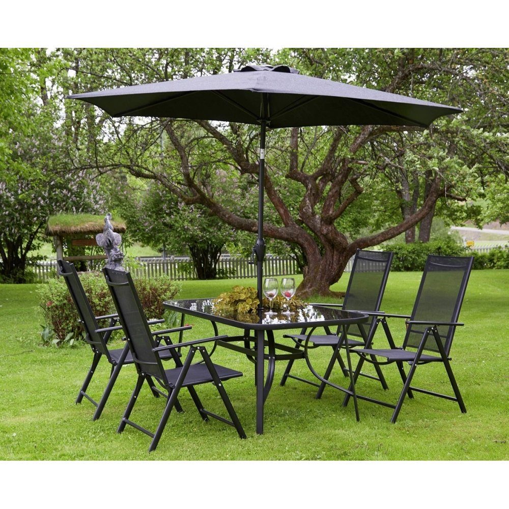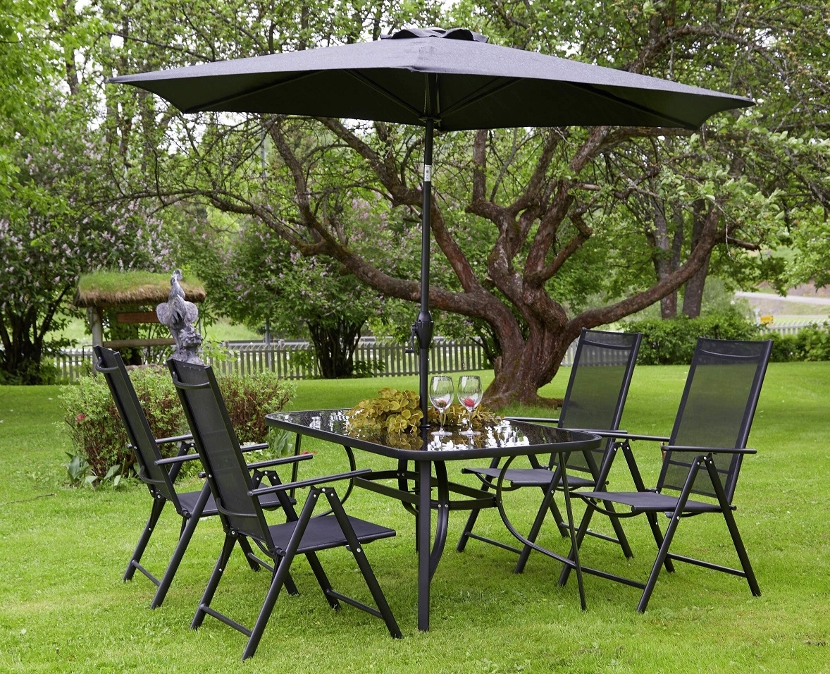 Easy Living By Martinsen, Stilren og praktisk spisegruppe i svartlakkert utførelse med bord, 4 stk. posisjonsstoler og parasoll, alt i én pakke. Topplaten på bordet er av herdet glass. Aluminiumstamme i bord og stol.