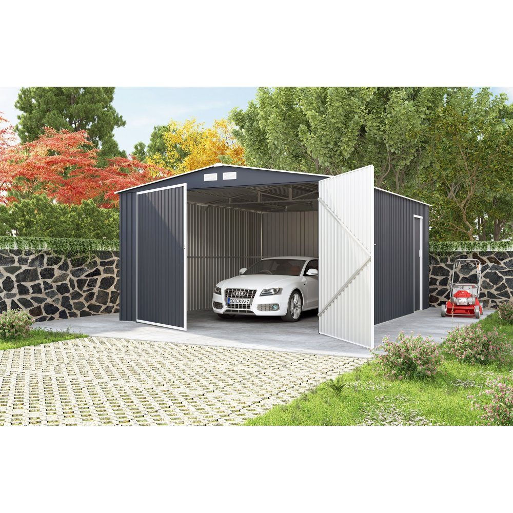 Denne robuste plategarasjen har et betydelig overflateareal på 18,2 m² og er bygget for å gi kjøretøyet og eiendelene dine pålitelig beskyttelse. Garasjen måler 380x480x232 cm og er konstruert av slitesterke stålplater med en tykkelse på 0,25 mm, som gir slitestyrke mot vær og vind. En generell ramme med tykkelse mellom 0,5-0,8 mm og forsterkninger i taket bidrar til at garasjen står stødig hele året.
