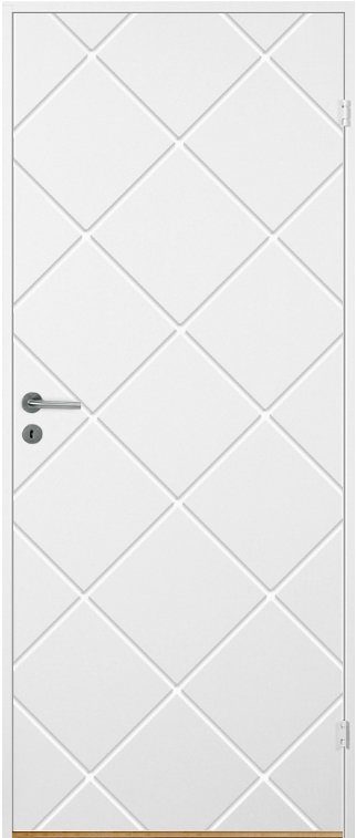 Hvitmalt kompakt innerdør med sporfrest dekor.