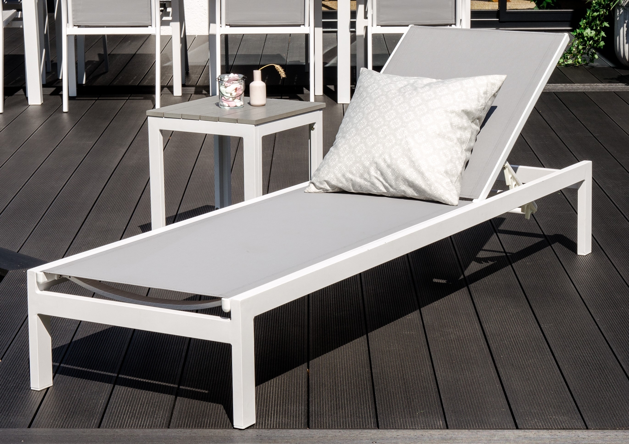 Den hvite aluminiumsrammen og det grå tekstilenmaterialet gir solsengen et tidløst og stilig utseende som passer perfekt inn i alle typer utemiljøer. Kombinasjonen av disse materialene gjør solsengen både enkel å vedlikeholde og holdbar, noe som gjør den til et utmerket valg for langvarig utendørs bruk.