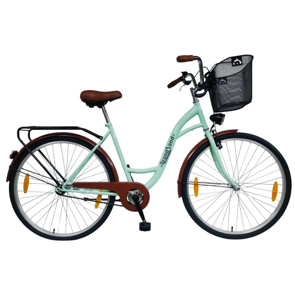 En klassisk og pålitelig damesykkel i en elegant pistasjgrønn farge. Den har en solid stålkonstruksjon og et komfortabelt skinnsete med fjæring for ekstra komfort. Utstyrt med både V-brems foran og fotbrems bak, noe som gjør den trygg og enkel å bruke i hverdagen. Batteridrevne LED-lys foran og bak gir god sikt selv på mørkere tider av dagen.