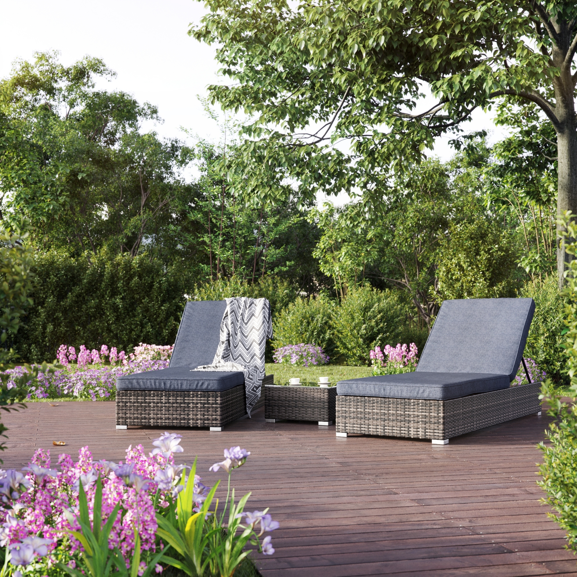 Sett med 2 stk. solsenger i flat kunstrotting med grå puter i stoff. Den øvre delen av solsengen er justerbar, for eksempel for den perfekte lesestillingen mens du nyter solen. Inkluderer også et lite bord i matchende kunstrotting.