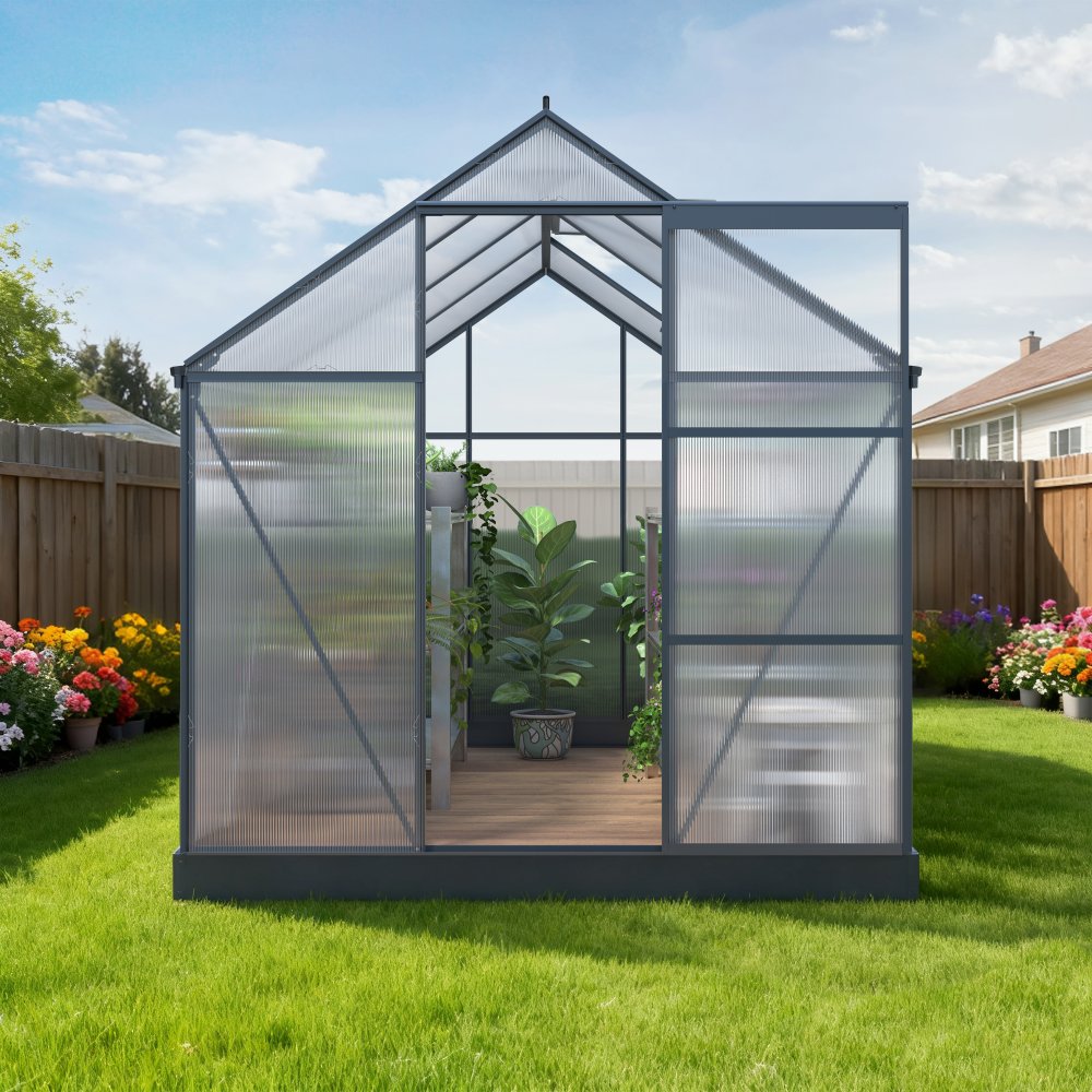 De 4 mm tykke, dobbeltveggede polykarbonatplatene beskytter plantene mot elementene, samtidig som de gir et behagelig lysinnfall for optimal vekst. Den galvaniserte stålbasen sikrer stabilitet, og den justerbare takluken gjør det enkelt å regulere ventilasjonen på varme dager.