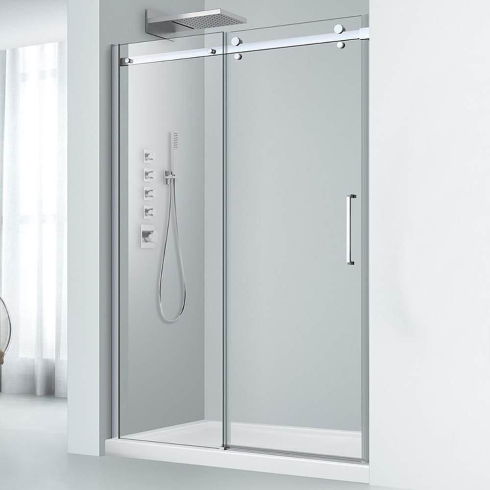 Dusjvegg med skyvedør. Veggen er laget av 8 mm klarglass med en krommet aluminiumsramme og rustfritt stål roller.