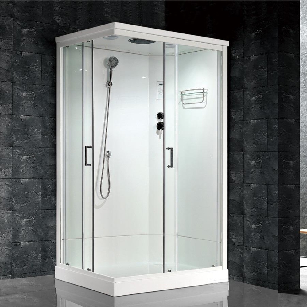 Dusjkabinens innervegger består av glass, og midtstykket der kranene sitter, består av plast.