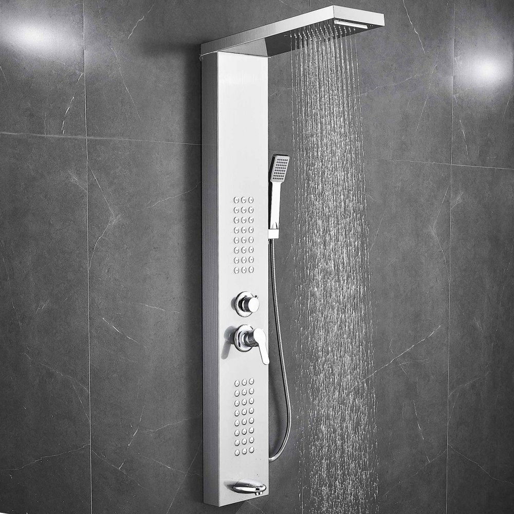 Dusjpanelet er laget av rustfritt stål med børstet overflate og tilbyr fem funksjoner: regndusj og fossefall øverst, hånddusj på siden, to seksjoner for bakdusj og badekarkran nederst. Blandebatteriet er en ettgrepsmodell som kontrollerer temperatur og vannmengde, og spraymodusene byttes via dreiebrytere.