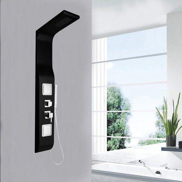 Sort dusjpanel med sølvdetaljer - med takdusj, ryggdusj og hånddusj.