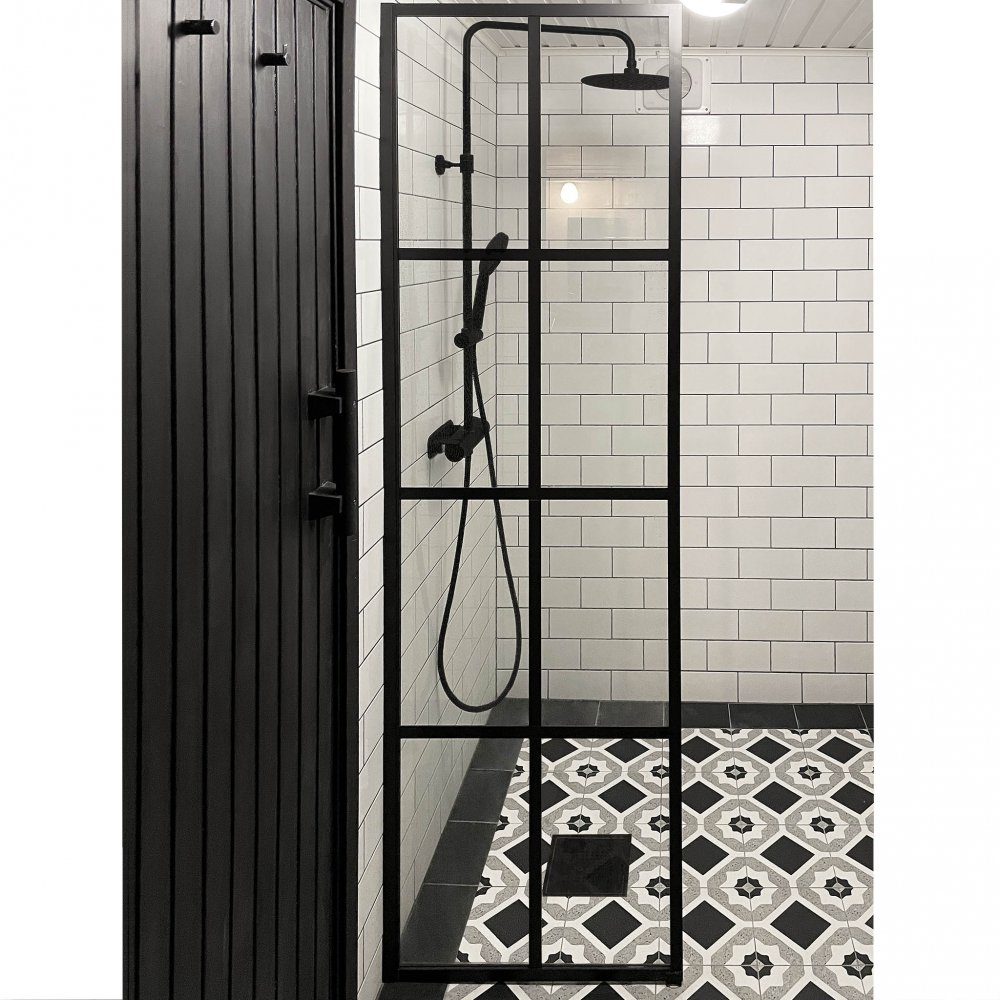 Dette dusjkabinettet er et stilig og funksjonelt valg for de som ønsker å skape et moderne dusjrom med en industriell følelse. Den faste dusjveggen er laget av 6 mm herdet sikkerhetsglass og har svarte aluminiumsprofiler med sprosser som gir et klart og trendy uttrykk på badet.