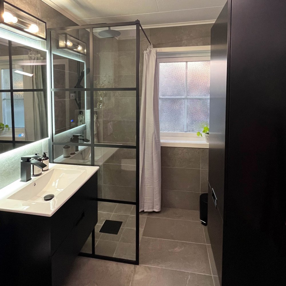 Dusjvegg med svarte profiler. Størrelse: 80 x 210 cm.