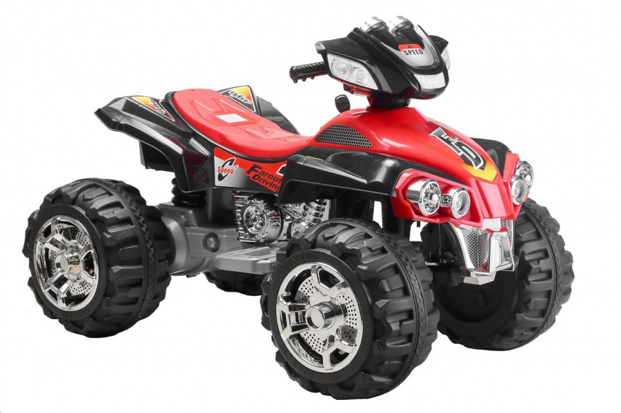 Elektrisk firehjuling for barn (alder: 3-8) med frekke lydeffekter. Hastighet 3-6 km/H (foran og bak). Maks belastning 30 kg.