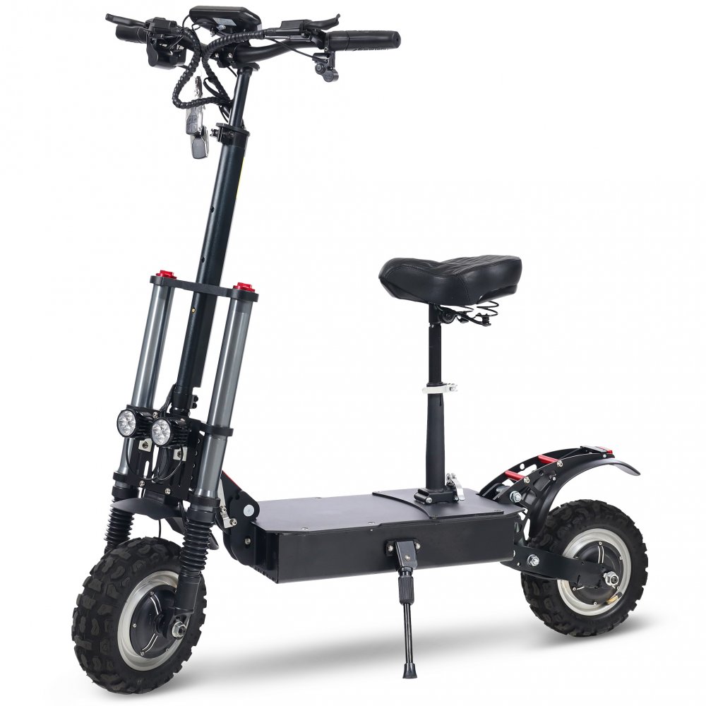 En førsteklasses elektrisk sparkesykkel i et tøft design som kombinerer høy ytelse og stabil konstruksjon. Med to sterke navmotorer på totalt 3200 W når sparkesykkelen en makshastighet på 80 km/t og takler til og med bratte oppoverbakker. Den robuste aluminiumsplaten med sklisikker overflate og det høydejusterbare setet gir både komfort og sikkerhet under kjøring. Scooteren tåler en maksvekt på 200 kg og er utstyrt med 12-tommers racingdekk for optimalt grep.
