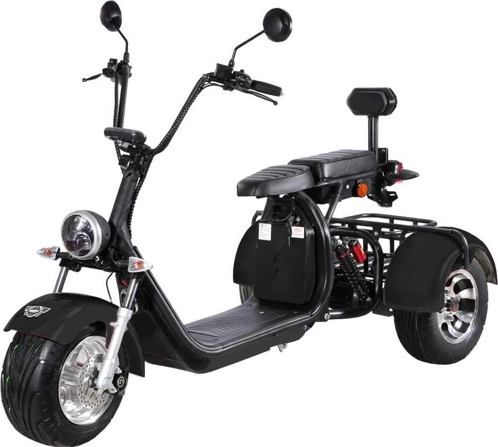 Elektrisk Trehjuls Scooter som drives av en børsteløs elmotor på 2000W. Motoren drives av et høykvalitativt 60 V / 20 Ah litiumbatteri. En full ladning har en rekkevidde på opptil 50 km, avhengig av omstendighetene. Batteriet oppbevares i et skap under setet, i gulvet under førerens føtter finnes det et annet skap, der du eventuelt kan plassere et ekstra batteri.