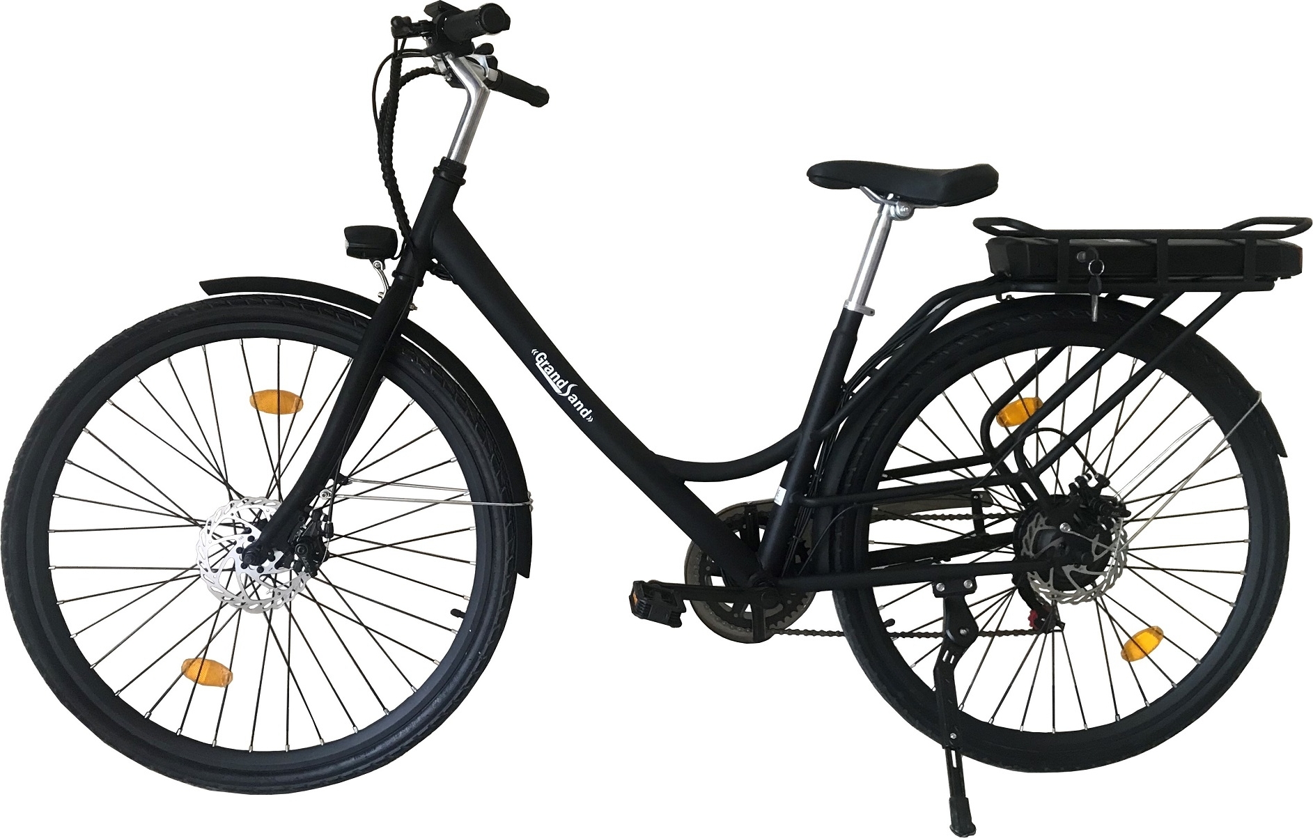 Elektrisk sykkel med en elmotor på 250W, drevet av et Li-ion-batteri på 36 volt og 10 Ah.