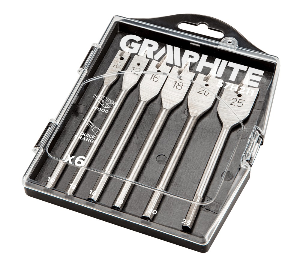 Sett med flate trebr 6,0-25 mm diameter, gir dobbel borehastighet og forhindrer at materialet fliser seg opp, takket være bladets profil.