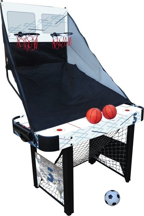 Denne nydelige 3 flerspillskonstruksjonen med basketball, fotball og bordhockey gir deg muligheten til å variere spillene mellom rundene. Utfordre hverandre og se hvem som kan legge flest basketballer i kurven på tildelt tid, eller hvem som setter det peneste skuddet i fotballmålet. Ved å ta ned posisjonen til basketballkurvene får du raskt en morsom bordhockeybane å samle poeng på.