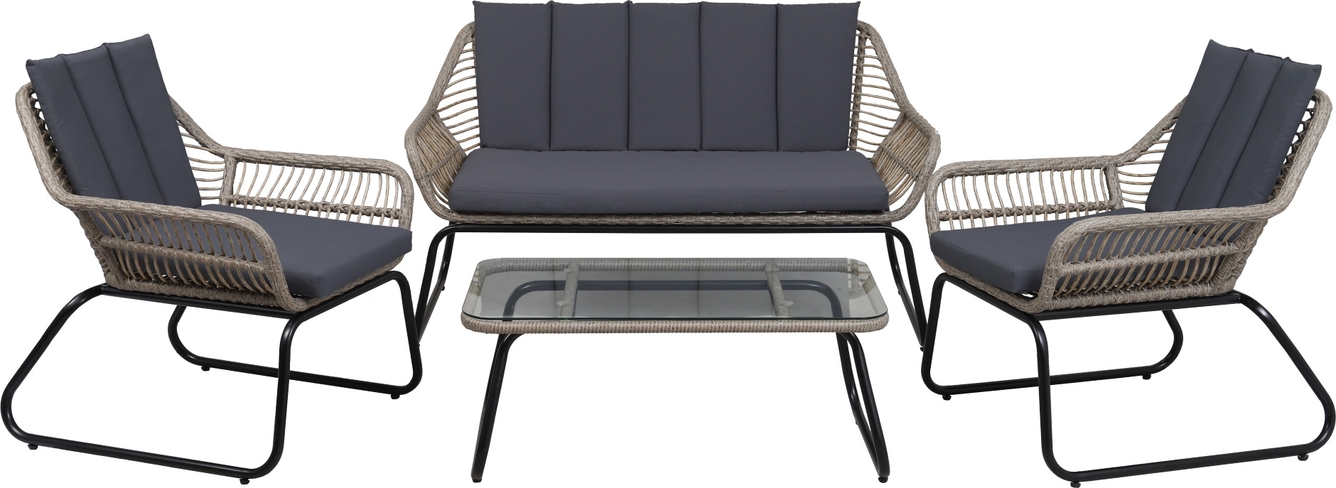 Florence utegruppe i grå kunstrotting (7 mm) med matchende mørkegrå polyesterputer. Værbestandig metallramme, pulverlakkert i svart. Bordet har en topplate av herdet glass.