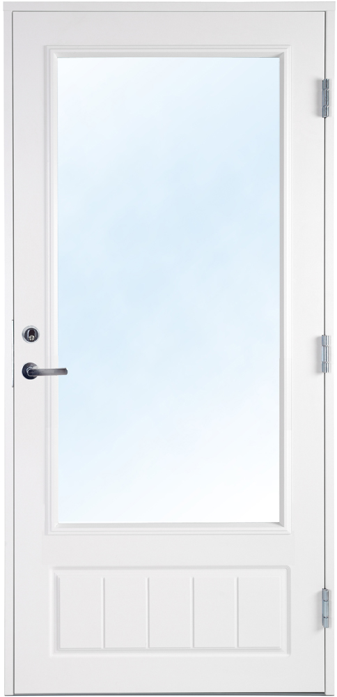 Døren er dekorert i bunnen både på innsiden og utsiden. Vinduet er en doble isolerrute med Argon, som gir lav U-verdi. Vinduet på denne døren er laget av sikkerhetsglass, som Boligtilsynet anbefaler for glassruter lavere enn 60 cm fra bakken.