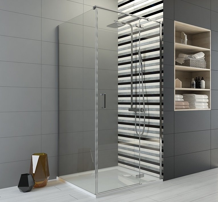 Dusjhjørne med utadgående dør. Glasspartiene i dusjhjørnet er laget av 6 mm sikkerhetsglass, glassbeskyttelsebehandlet som standard. GLASS PROTECT glassbeskyttelse er en overflatebehandling som gjør at vannet renner lettere av og etterlater seg mindre kalk og smuss. Tett dørlukking er garantert av magnetiske dørlister. Høyde 200 cm. Modellen er tilgjengelig i flere størrelser.