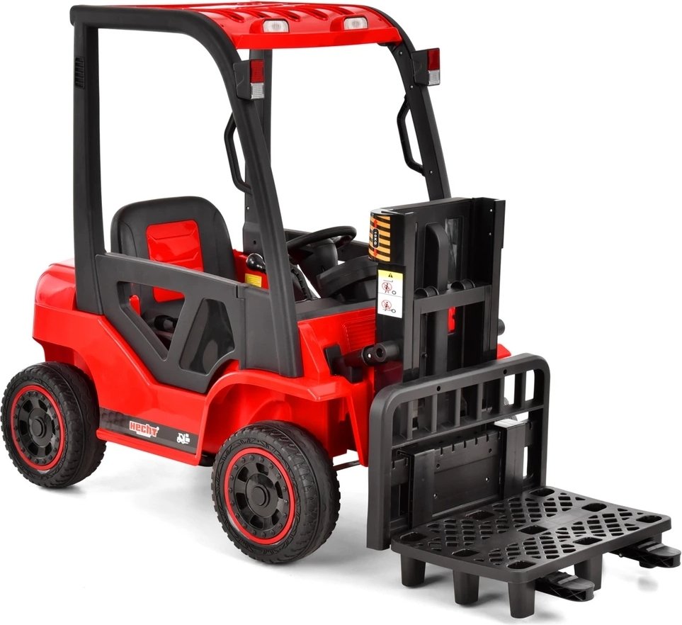 Batteridrevet lekekjøretøy/gaffeltruck for barn. Det er mulig å styre forover og bakover, stille inn hastigheten fra 2 til 6 km/t og selvfølgelig heve og senke forgaflene. Det følger også med en gratis plastpall, hvor barna kan oppbevare lasten og deretter håndtere den som en ekte lastebil. Den har også lys, MP3-spiller med USB og bluetooth.