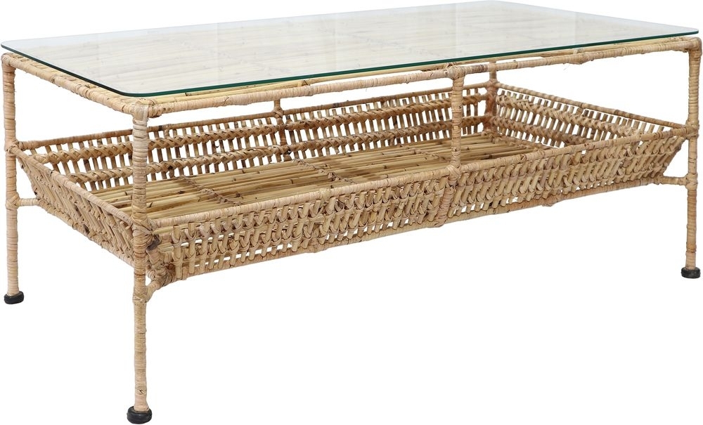 Galice salongbord i naturfarget rotting med stabil metallramme, trukket med rotting. Topplate av glass, praktisk underhylle. Galice-serien har også lenestol og sofa.