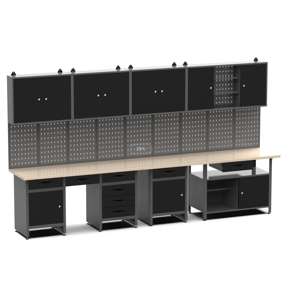 Med et lettmontert knock-down-system er installasjonen smidig og enkel, slik at du raskt kan begynne å bruke det nye systemet. Oppbevaringsløsningene inkluderer et veggskap med tre dører, tre veggskap med to dører, samt opphengsplater for oppheng av verktøy og utstyr.
