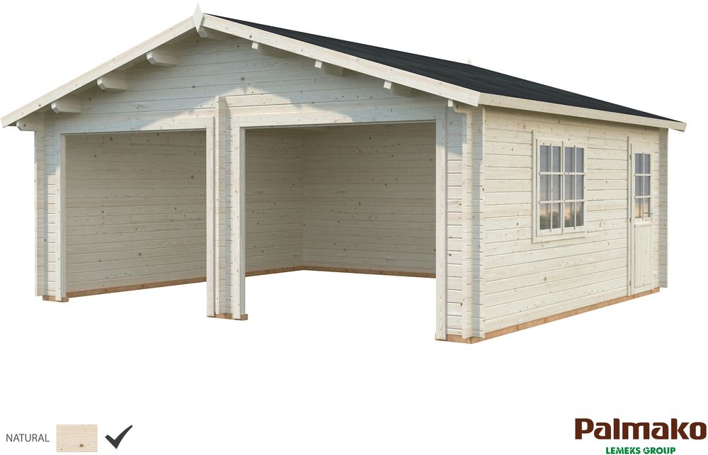 Dette byggesettet leveres uten porter. Denne garasjen er også tilgjengelig med svingport eller takport.