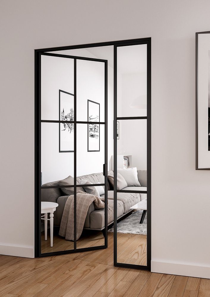 Det integrerte sidepanelet forsterker det industrielle utseendet og gir designet en symmetrisk balanse. Glassdøren passer godt til for eksempel stuer, ganger eller kontorer, der du ønsker å skape et åpent, men avgrenset miljø.
