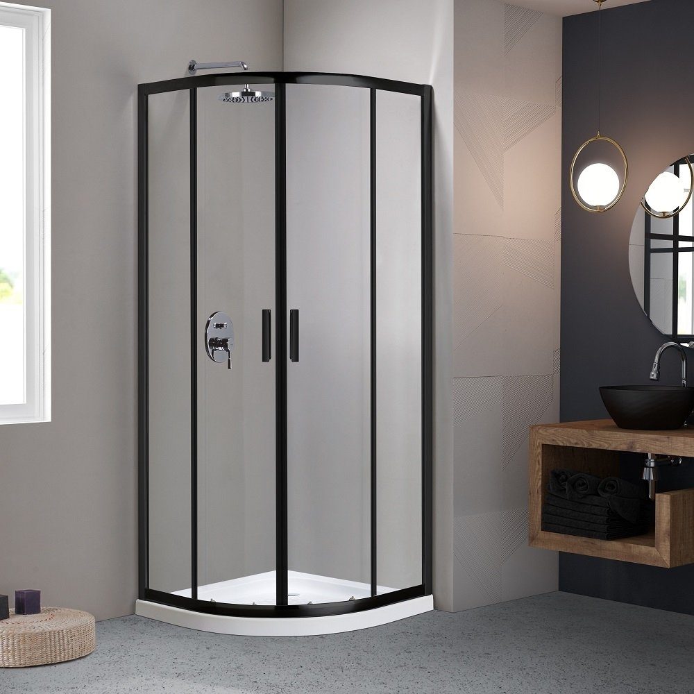 Svart, kvart-rundt dusjhjørne med klarglass og skyvedører.
